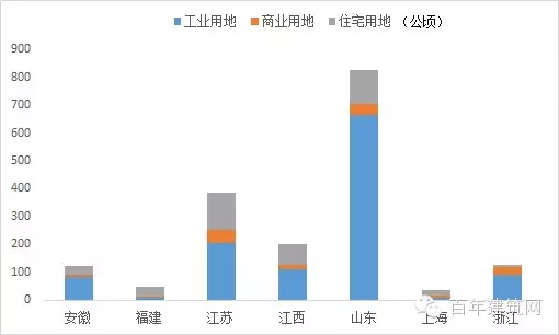 据百年建筑网监测数据显示,从成交面积来看,本期华东地区共成交经营性土地1743.61公顷,其中工业用地土地成交面积1170.80公顷,商业用地成交面积152.32公顷,住宅用地土地成交面积420.49公顷。