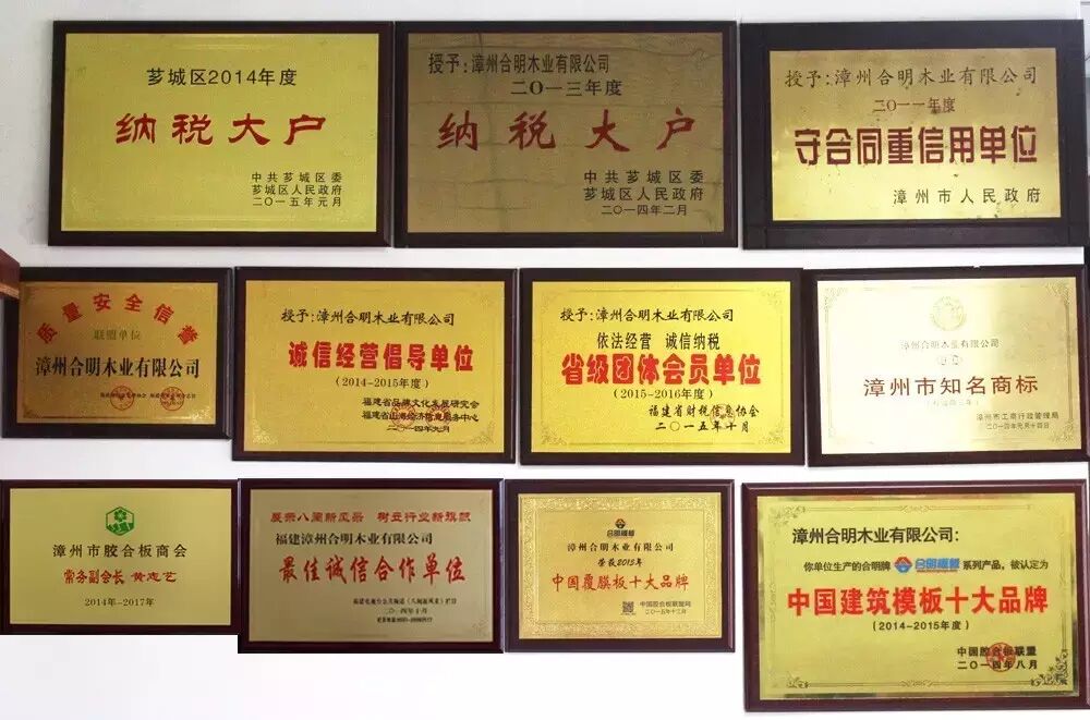 合明模板是福建省最大的建筑模板制作厂家,也是19年建筑模板老厂,日产建筑模板50000张。合明模板连续三年被评为“中国建筑模板十大品牌”,连续三年获得“纳税大户”荣誉称号,并被评为“依法经营、诚信纳税单位”、“质量安全信誉单位”、“诚信经营倡导单位”、“守合同重信用单位”等众多殊荣。合明经营管理规范,企业诚信,合作放心。