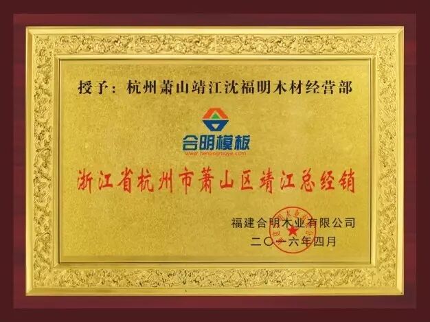 合明授予各县、区总代理合明模板经销证明牌匾,以证明是合明模板区域总代理,合明将制作合明模板各个荣誉奖牌复印本,免费颁发予合明模板总代理悬挂展示。