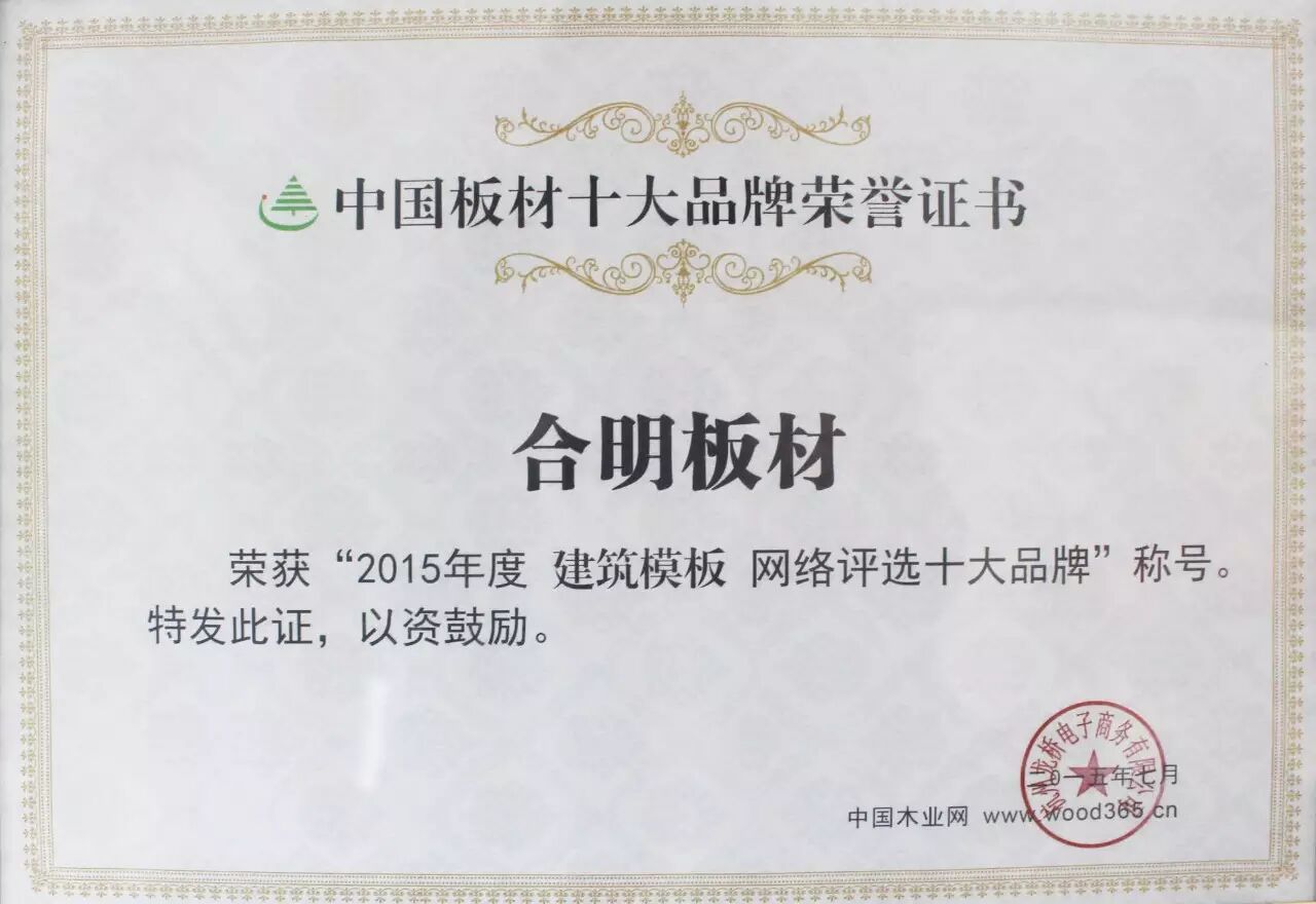 合明模板,中国建筑模板十大品牌证书