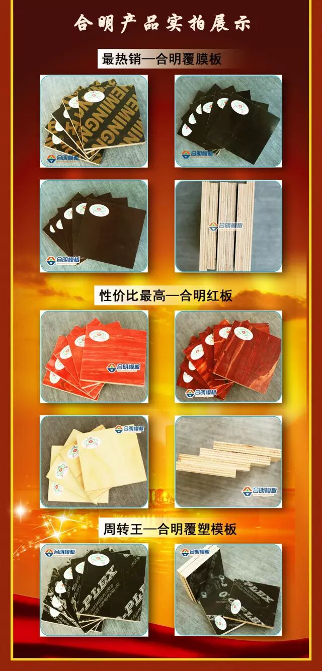 合明模板,坚硬耐磨、密实牢固、平整细腻、柔韧性好、超强防水、不易脱胶、周转次数高,赢得广大用户青睐。合明模板质量看得见,高压锅沸水煮2小时不开胶,质量保证,好评不断,品牌知名度高,获得“中国建筑模板十大品牌”、“知名商标”等多项荣誉。合明共有建筑模板近200种,如一建筑模板超市,产品种类多,可挑选,客户都能在合明找到适合自己工地的产品。