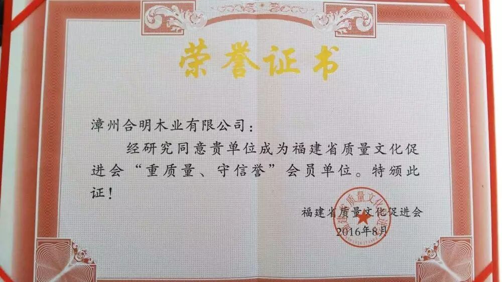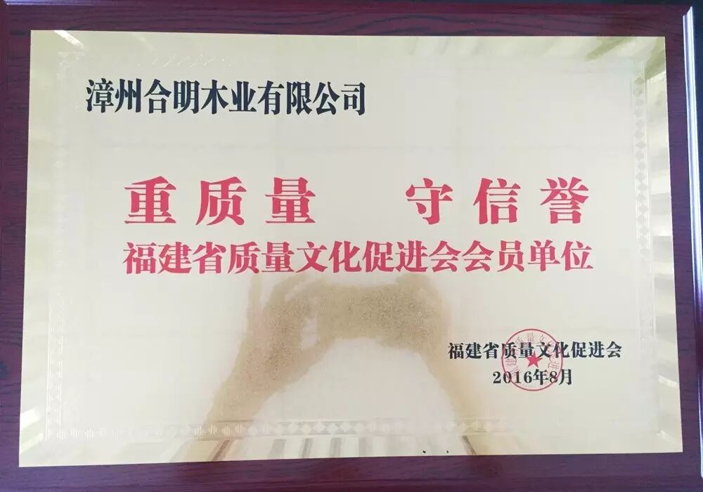 8月,合明模板被评为“重质量,守信誉”福建省质量文化促进会会员单位,该荣誉是合明重视质量、专注品牌、产品质量过硬的成果,获得该荣誉意味着合明在今后的经营中,受质量促进会的监管,严格把握质量关,给客户带去更加耐用的产品,促进企业和客户的诚信合作,不辱“重质量,守信誉”的殊荣。