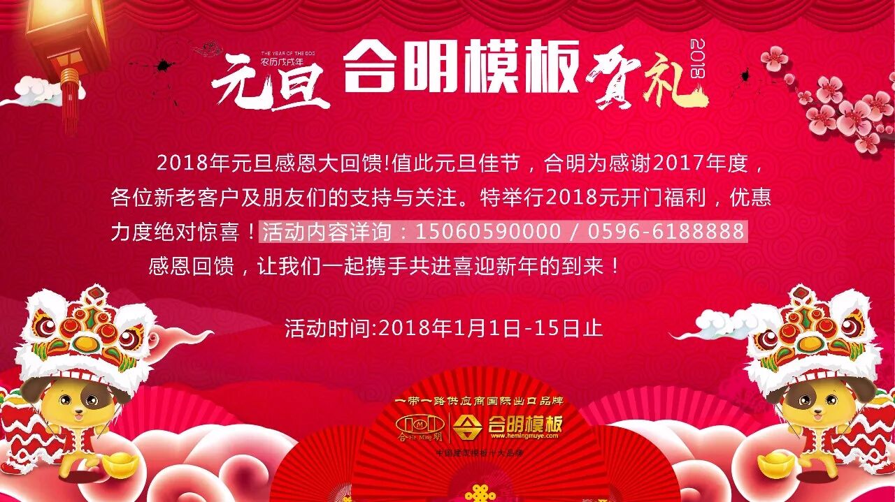 元旦好消息 2018年元旦感恩大回馈!值此元旦佳节,合明为感谢2017年度各位新老客户以及朋友们的支持与关注,特举行2018元开门福利,优惠力度绝对惊喜!!!了解详情欢迎来电咨询:15060590000/0596-6188888。 活动时间:2018年1月1日至15日止。 让我们一起携手共进喜迎新年的到来! 漳州合明木业 2018年元旦 生产倒计时 元旦钜惠 随着2018年元旦到来,鸡年开始进入了生产倒计时。合明工厂预计农历十二月十五开始停止生产。 元旦特惠,合明特推最后一波让利!年后模板将持续涨价!最后优惠期,抓紧下单,莫要错过最后机会! 合明覆膜板 合明红板 合明苯酚板 合明清油板 合明覆塑板 (向左滑动图片查看) 合明模板特惠让利! 过年后模板确定涨价!近期发货多 2017年对于建材行业是波动艰难的一年,环保检查、停工停产、原材料飙涨,木材料、胶水运费各种涨,汇率波动,方方面面都直接影响到建筑模板的价格,2018年将持续涨价狂潮!抓紧年底合明感恩回馈良机,多多下单备战2018年涨价潮! 近期,合明建筑模板发货量大增,合明建议新老客户及时下单,日产量有限,先订单先排单生产,活动时间仅为半个月,趁着低价抓紧囤货! 本周合明模板国内发往地包括蚌埠、温州、泉州、景德镇、宁波、丽水、海沧、合肥、嘉兴、龙岩、杭州、奉化、深圳、赣州、台州、长沙、抚州、揭阳、漳州、九江、杏林等地区。发货建筑模板品种主要为合明中英文覆膜板、和合明苯酚桉木芯板。