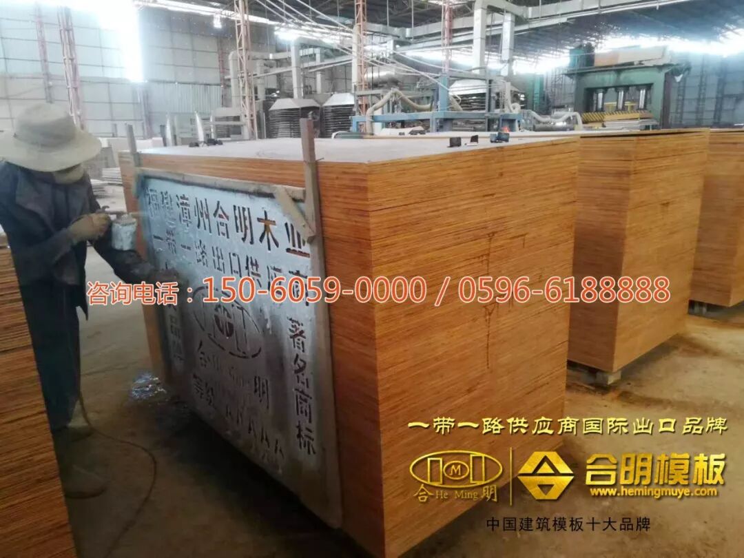 合明一线工人在喷印合明专属品牌LOGO,合明工厂对合明生产的每一张建筑模板敢于质量保证。21年老品牌,品质信得过!